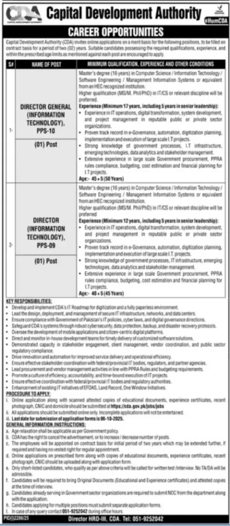 Capital Development Authority (CDA) invites applications on merit basis for the recruitment of Director General (IT) and Director (IT). The appointments will be made on a contract basis for 2 years (extendable). Last date to apply online is 06 October 2025.