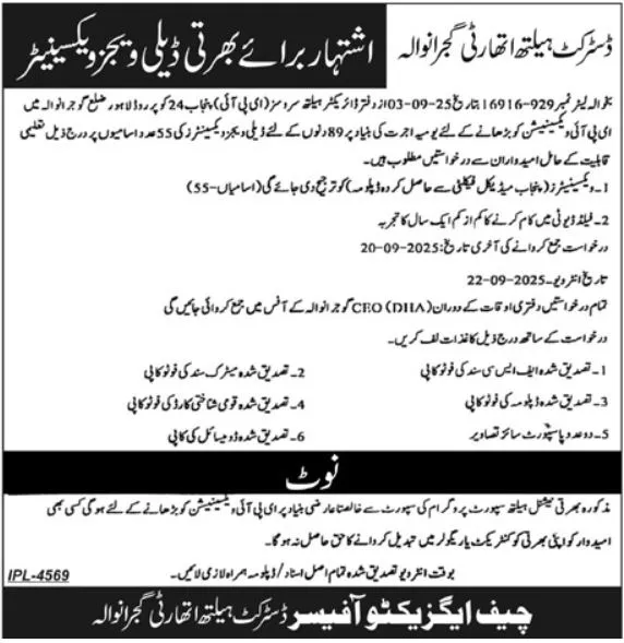ڈسٹرکٹ ہیلتھ اتھارٹی گوجرانوالہ نے نیشنل ہیلتھ سپورٹ پروگرام کے تحت ای پی آئی ویکسی نیشن کو بڑھانے کے لئے 55 ڈیلی ویجز ویکسینیٹرز کی آسامیوں کا اعلان کیا ہے۔ یہ خالصتاً عارضی اسامیاں ہیں اور کنٹریکٹ یا ریگولر بنیاد پر تبدیل نہیں ہوں گی۔ درخواست جمع کرانے کی آخری تاریخ 20 ستمبر 2025 ہے جبکہ انٹرویوز 22 ستمبر 2025 کو ہوں گے۔