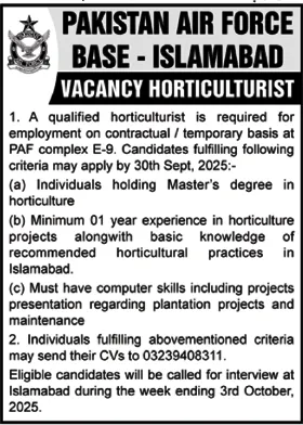 Pakistan Air Force (PAF) is inviting applications for the position of Horticulturist at PAF Complex E-9, Islamabad. The role is offered on a contractual/temporary basis. Candidates with the required qualifications and experience are encouraged to apply before 30th September 2025.