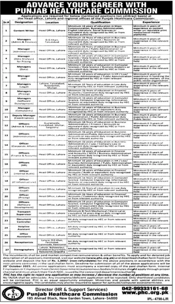 پنجاب ہیلتھ کیئر کمیشن (PHC) نے اپنے ہیڈ آفس لاہور اور پنجاب کے مختلف ریجنل دفاتر (ڈی جی خان، فیصل آباد، راولپنڈی، ملتان، گوجرانوالہ، بہاولپور اور سرگودھا) میں مختلف اسامیوں پر کنٹریکٹ کی بنیاد پر بھرتی کا اعلان کیا ہے۔ یہ آسامیاں مینیجرز، ڈپٹی مینیجرز، آفیسرز اور سپورٹ اسٹاف کے لیے ہیں، جن میں ایڈمنسٹریشن، فنانس، ایچ آر، لاء، ڈیٹا اینالسس، آئی ٹی، آڈٹ اور دیگر شعبے شامل ہیں۔