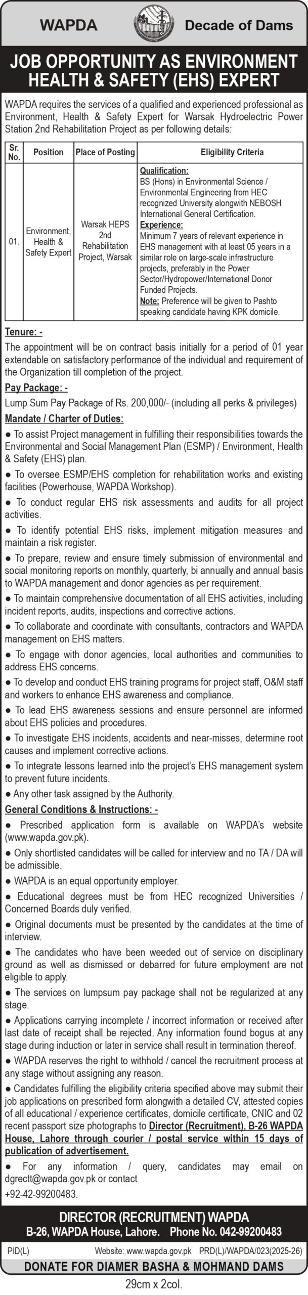 Latest announcement of WAPDA Jobs 2025.Water & Power Development Authority (WAPDA) has announced a vacancy for Environment, Health & Safety (EHS) Expert at the Warsak Hydroelectric Power Station 2nd Rehabilitation Project. This is a contract-based position with an attractive salary package.
